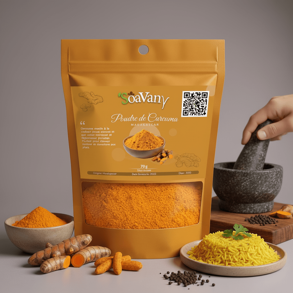 Poudre de curcuma issue de Madagascar, finement moulue pour préserver sa couleur dorée intense et son parfum chaud légèrement poivré.