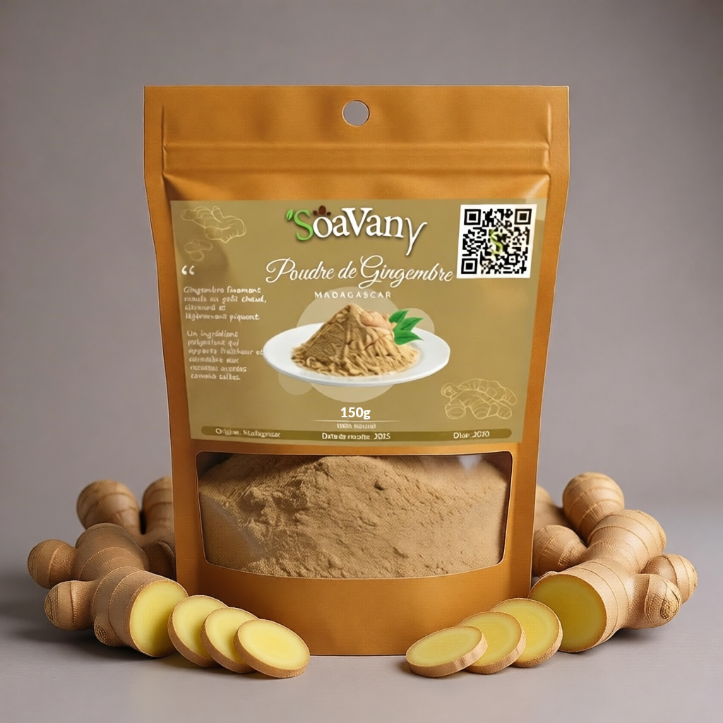 Poudre de gingembre originaire de Madagascar, obtenue à partir de racines soigneusement séchées puis finement moulues afin de préserver leur parfum naturellement épicé et légèrement citronné.