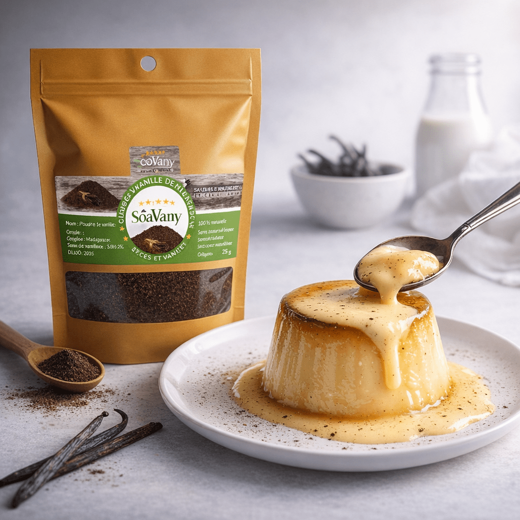La poudre de vanille Bourbon de Madagascar est une épice naturelle obtenue à partir de gousses de vanille séchées et finement moulues. Elle est destinée à un usage culinaire, idéale pour parfumer les préparations sucrées et salées. Son arôme doux et équilibré s’intègre parfaitement dans les recettes de pâtisserie, desserts, boissons chaudes et créations artisanales. Pratique à utiliser, elle permet une diffusion homogène de la saveur de vanille dans vos préparations.